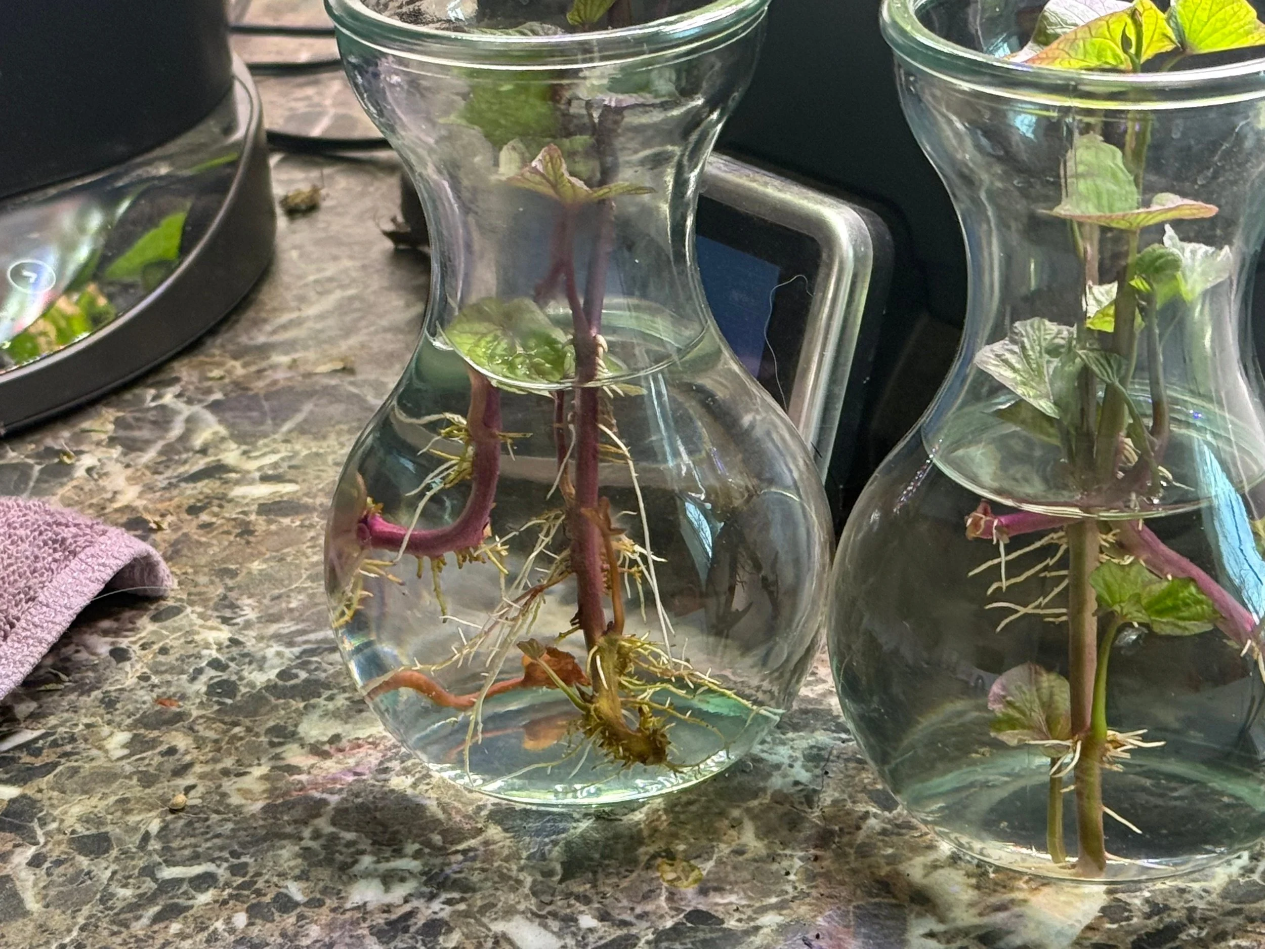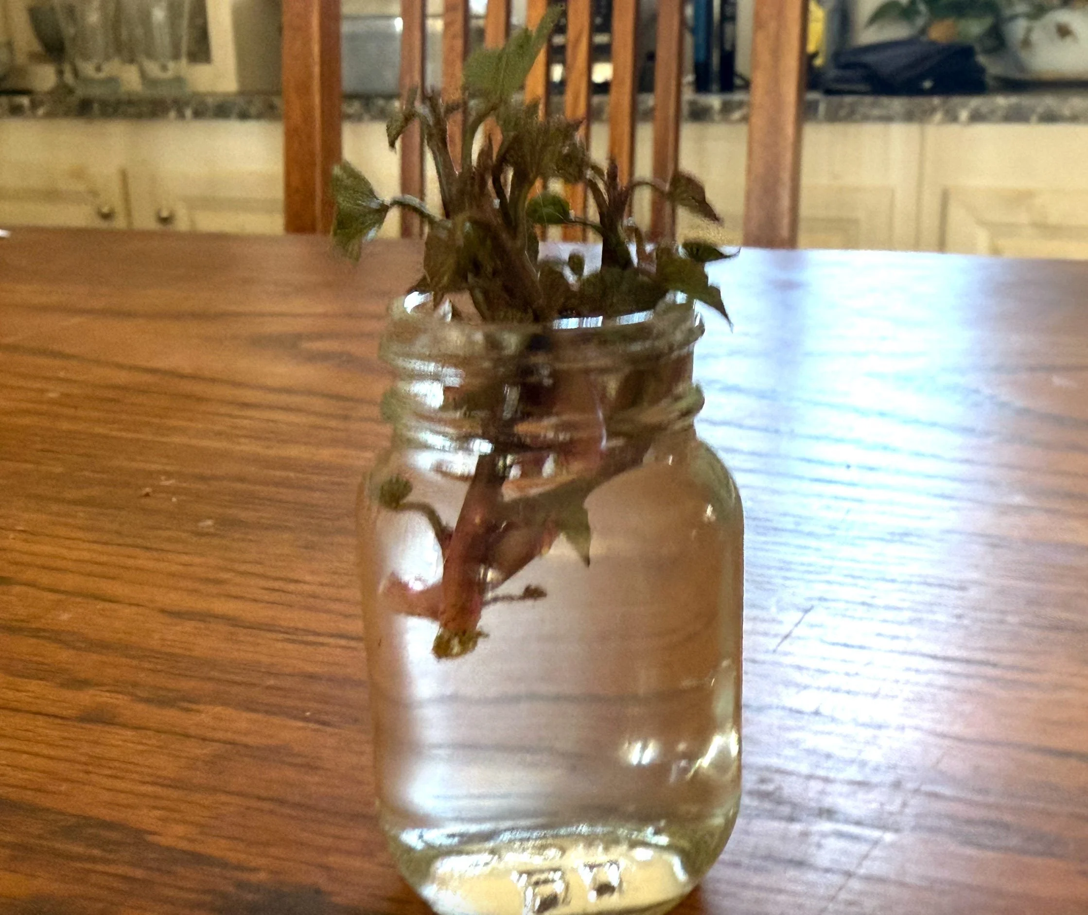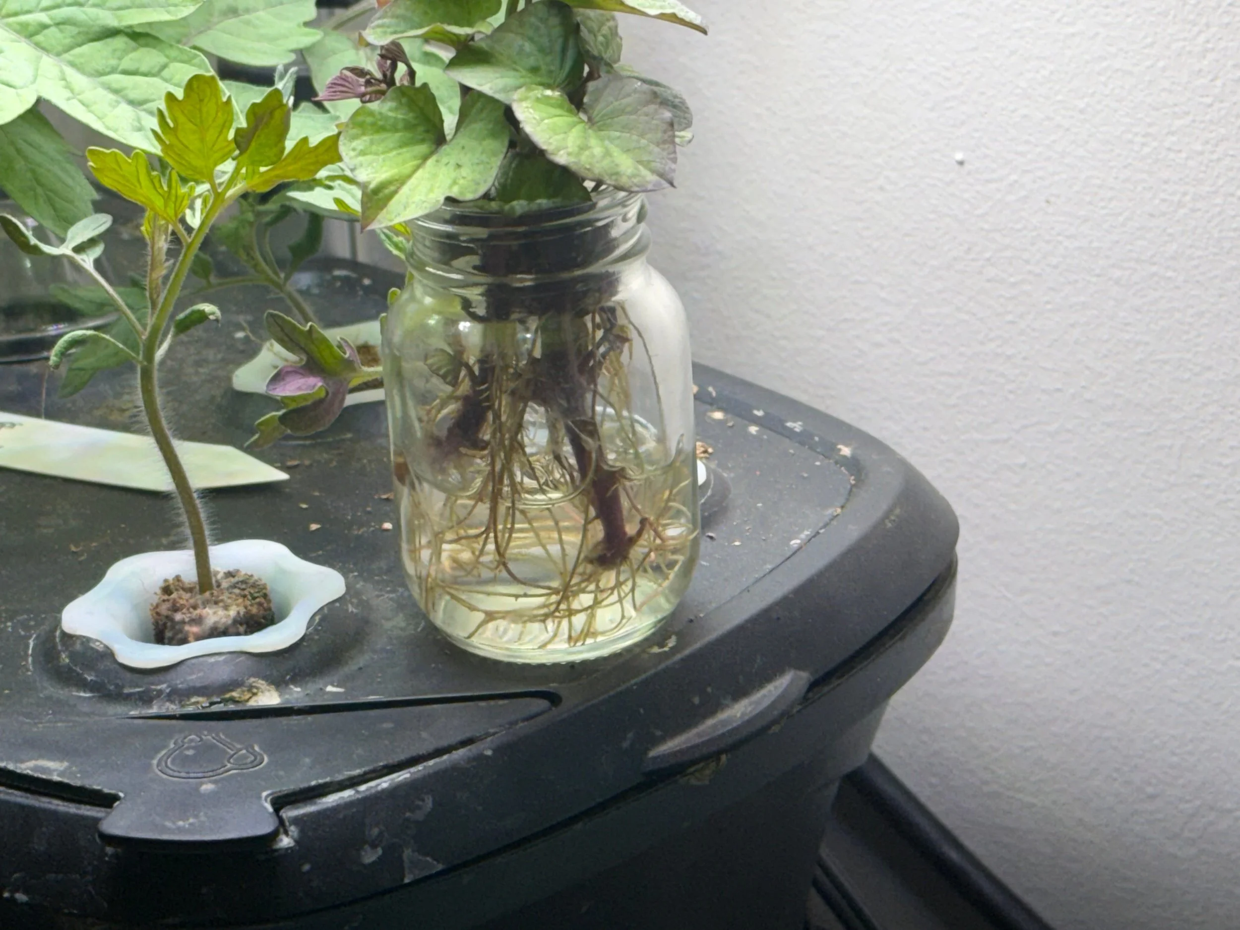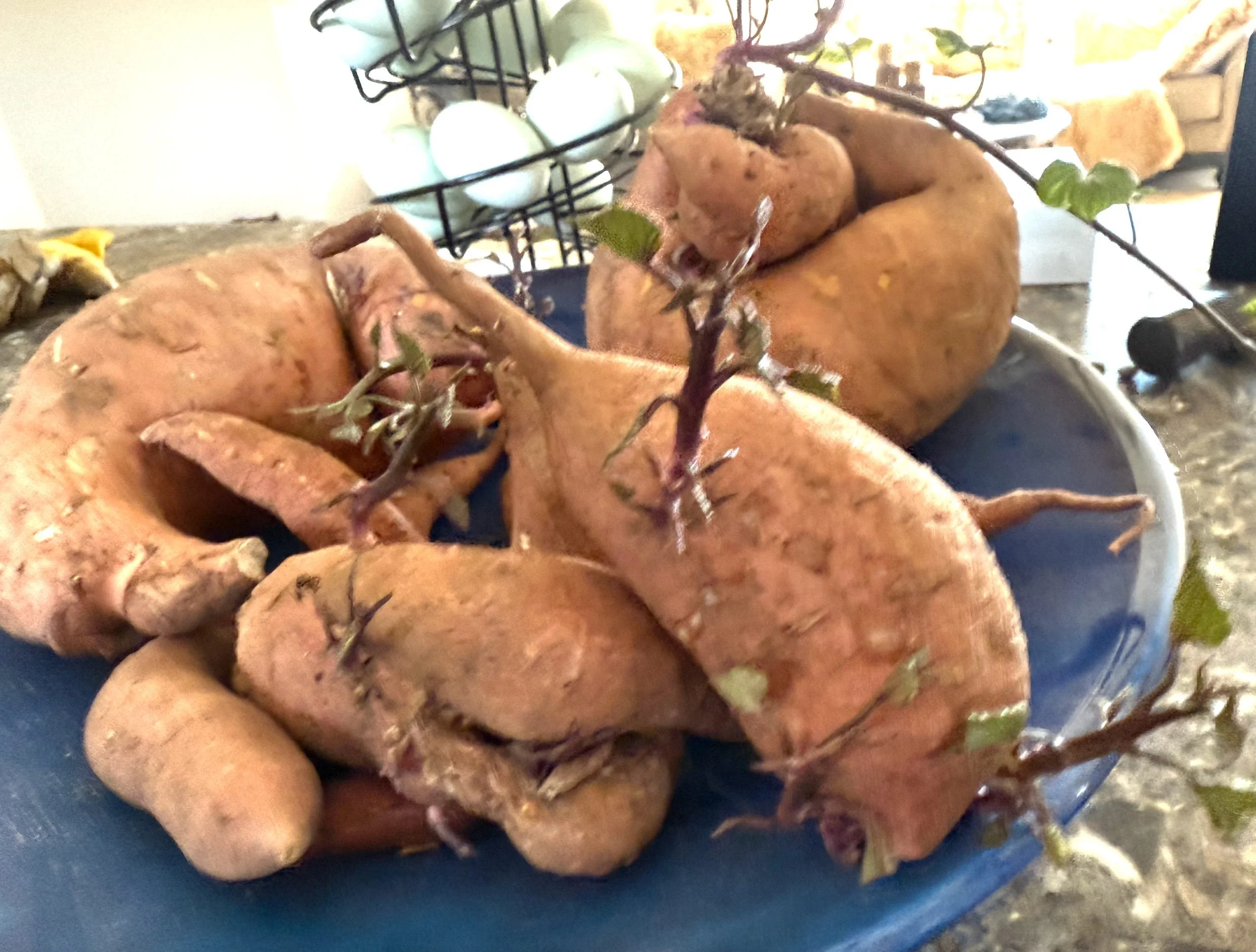 Last year we had a bumper crop of sweet potatoes, which we do eat some of, but often just cook them up for the chickens and the dogs. As the old tubers sprouted, we cut off the sprouts at the base and put them into jars of water. They then form roots and are now ready to be planted out.