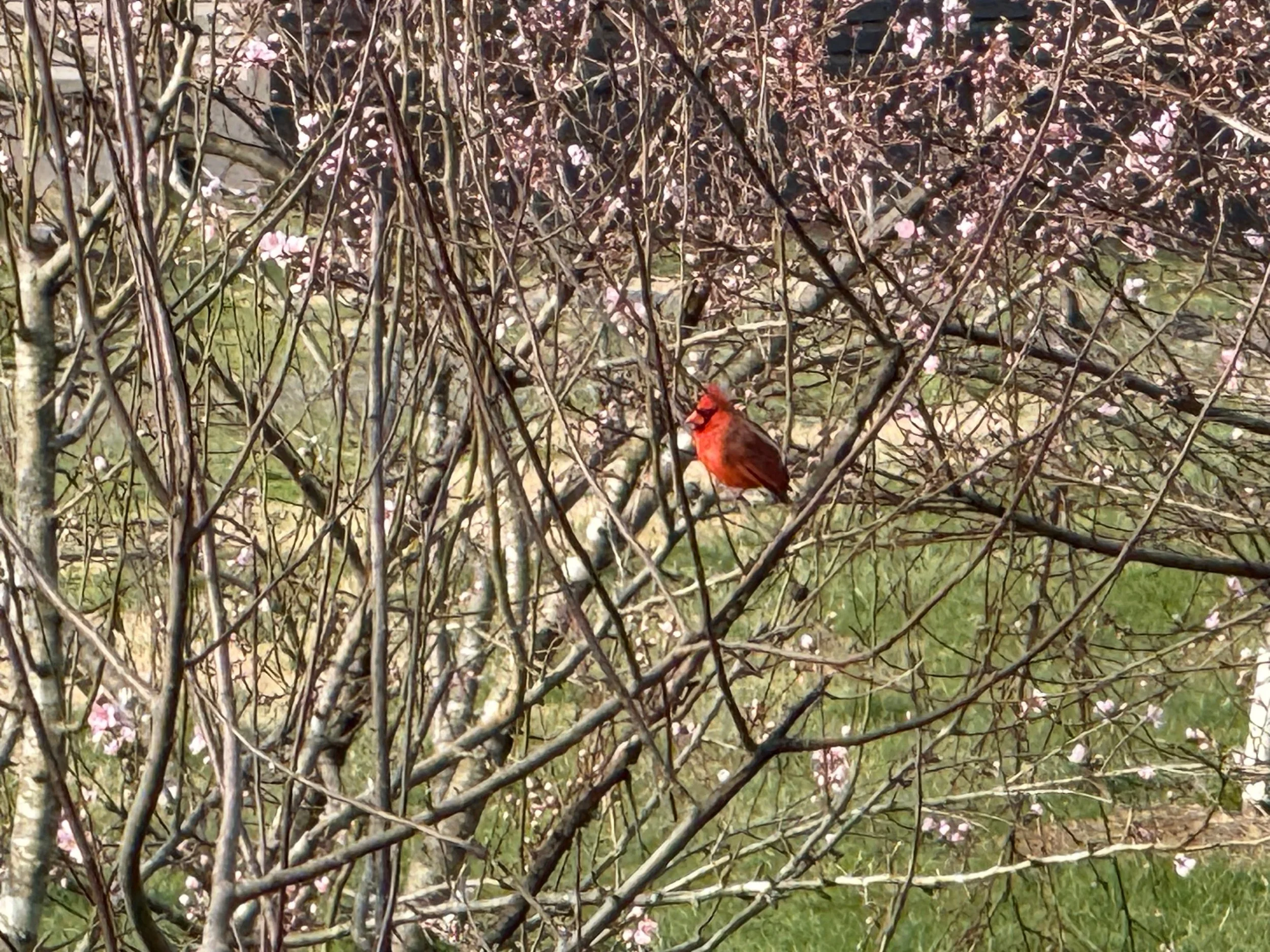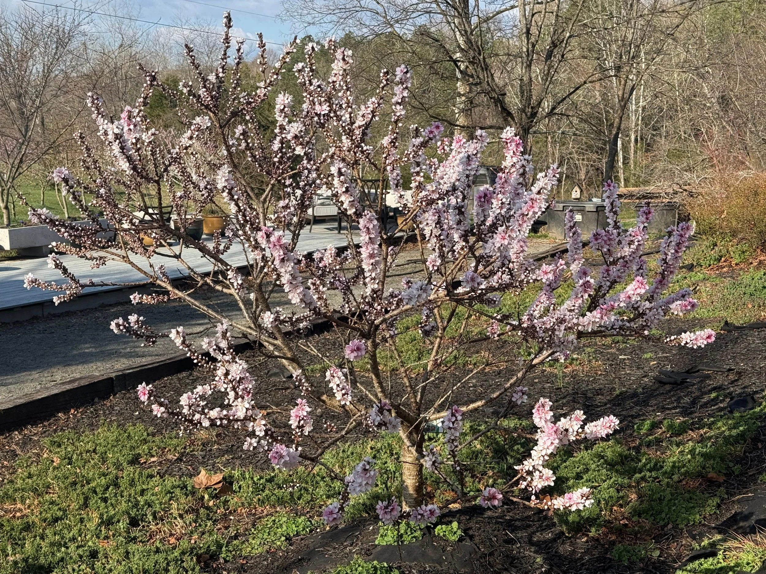 The dwarf bonfire peach is a favorite of ours - this tree is excellent for small gardens, as it is a tiny tree! The leaves are a brilliant reddish color.