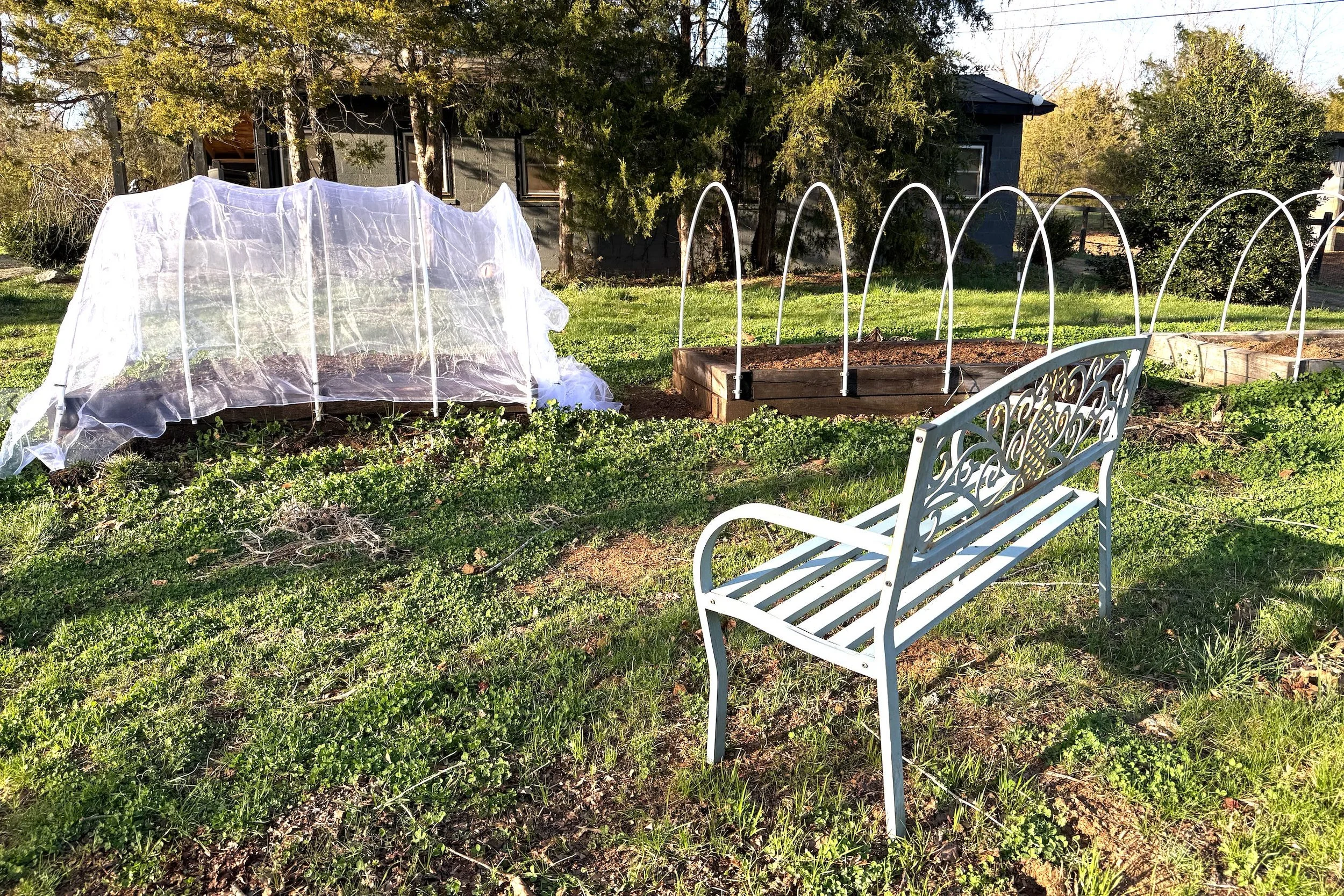 For the onion sets, parsley, and kale bed, I netted the hooped beds - the netting keeps the soil a little warmer and also serves as a barrier for goose and emu.