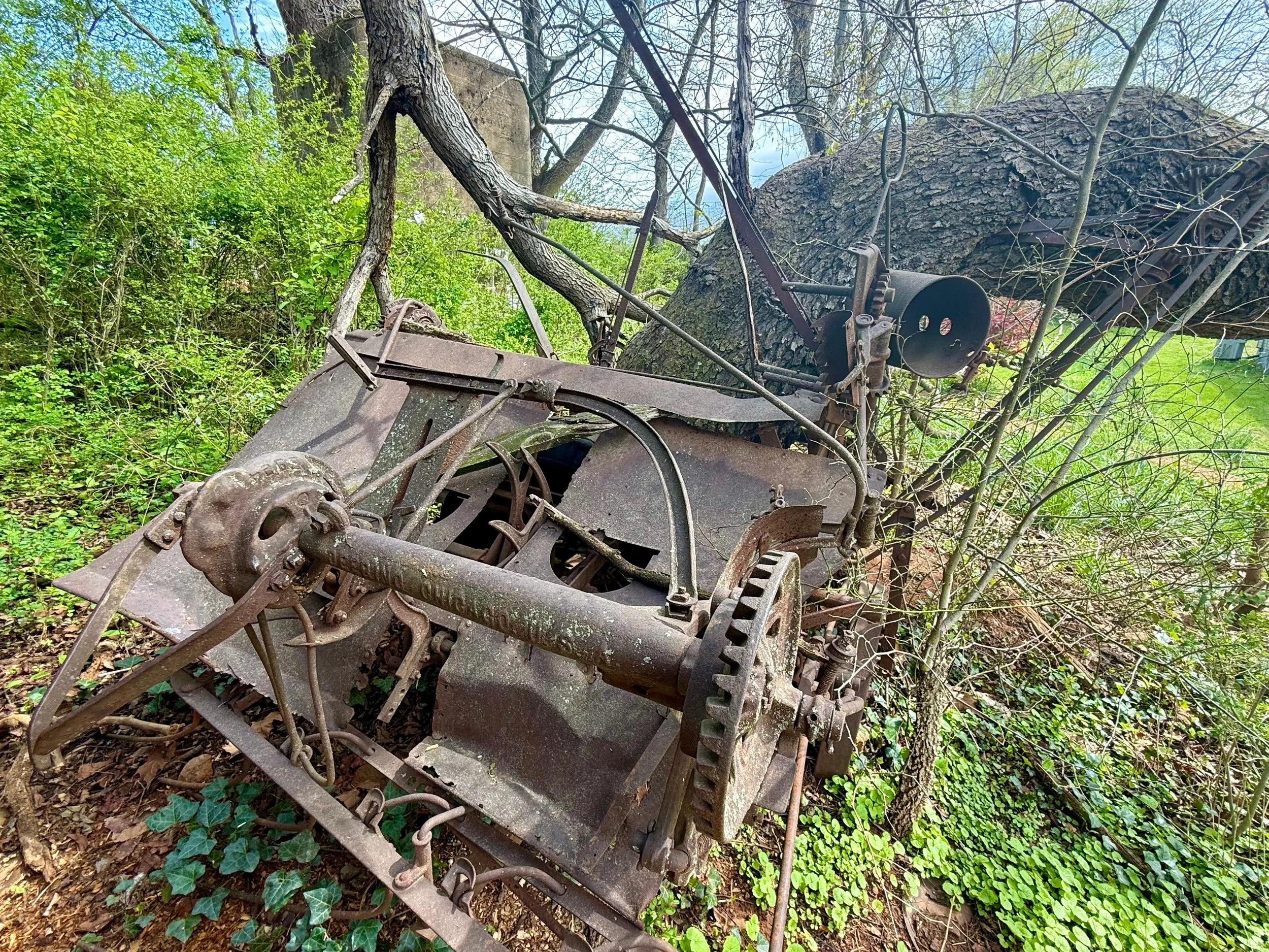Old farms in the east always seem to have old farm equipment discarded long ago. This old horse-drawn piece of something has a big old cherry tree growing up through it.