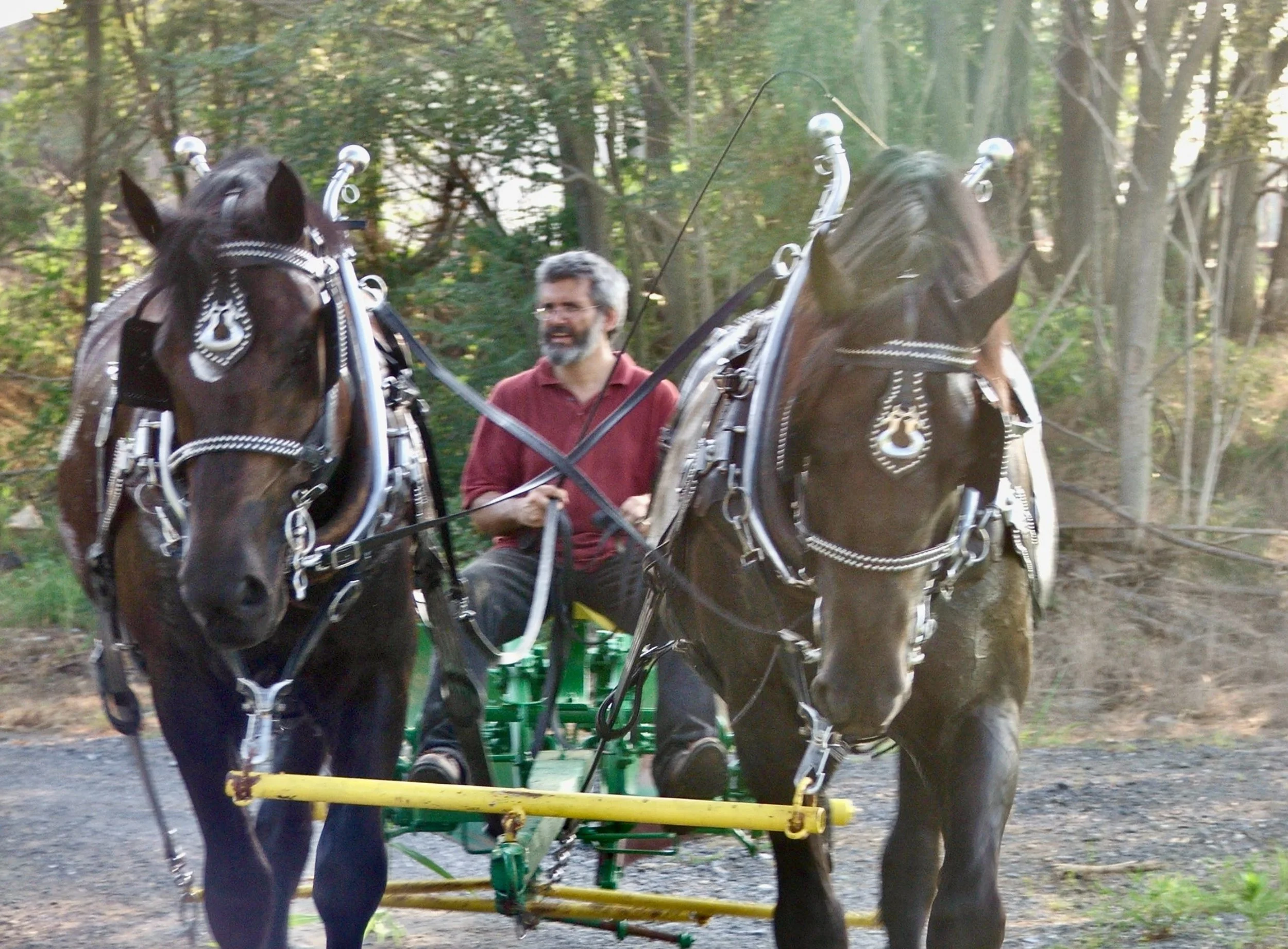 We discovered the Maryland Draft Horse and Mule Association, and were encouraged to attend their workshops and events, we purchased books on harnessing and work horses, and slowly learned the craft of working big horses. Earl Nicholson, a very old dairy farmer in Maryland took us under his wing - and we spent countless hours on his farm helping him and he us.