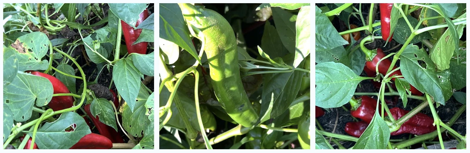 It's hard to see, but there are also pepper plants in that mound of plant matter. Just move back the greenery, and behold! There are poblanos, Anaheims, bell peppers, and pimentos—tens of pounds of them! Jill plans to dehydrate and freeze them all soon. We have been eating peppers in just about everything she cooks lately.