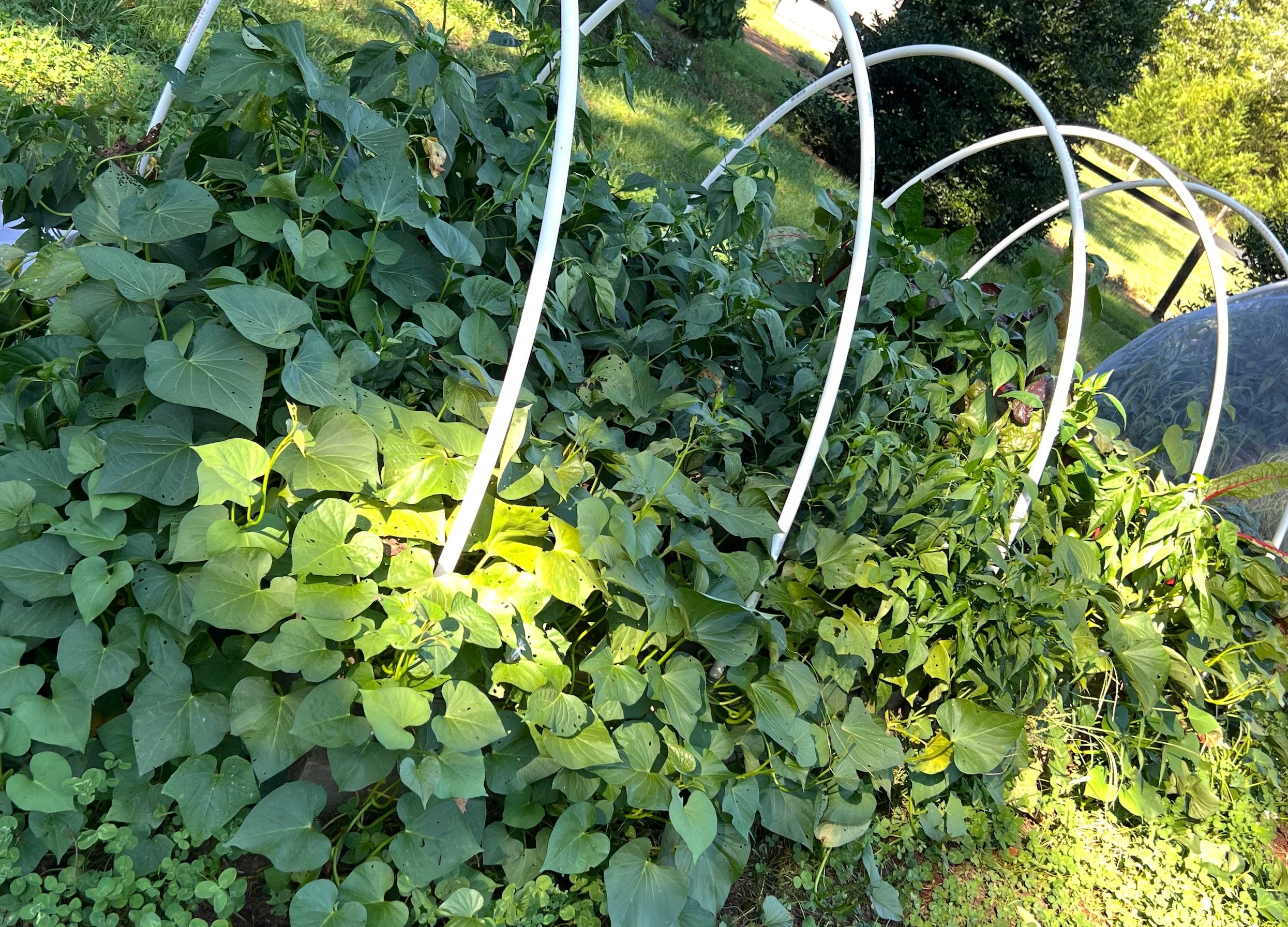 Below is our sweet potato, pepper, and Swiss chard bed: