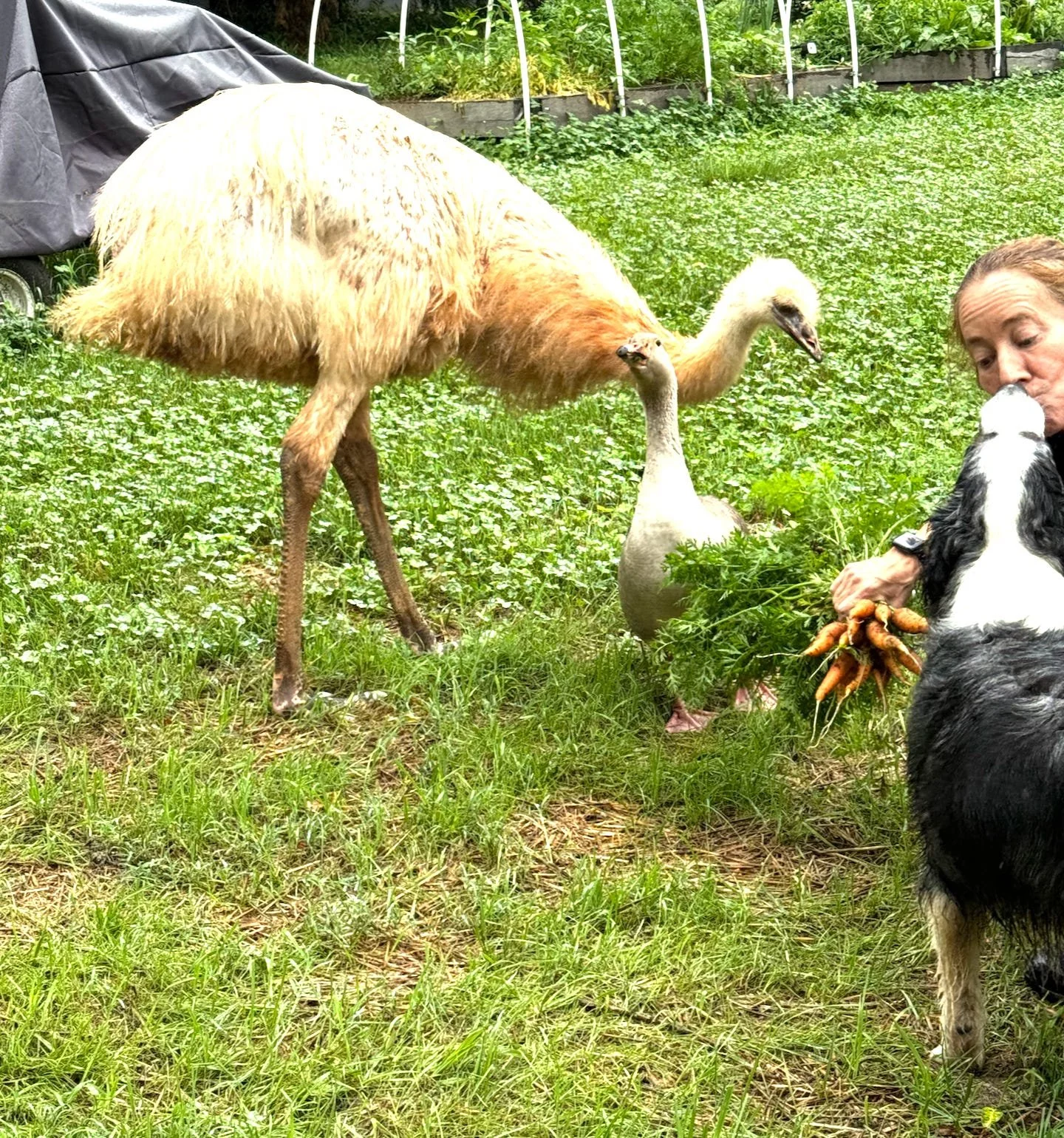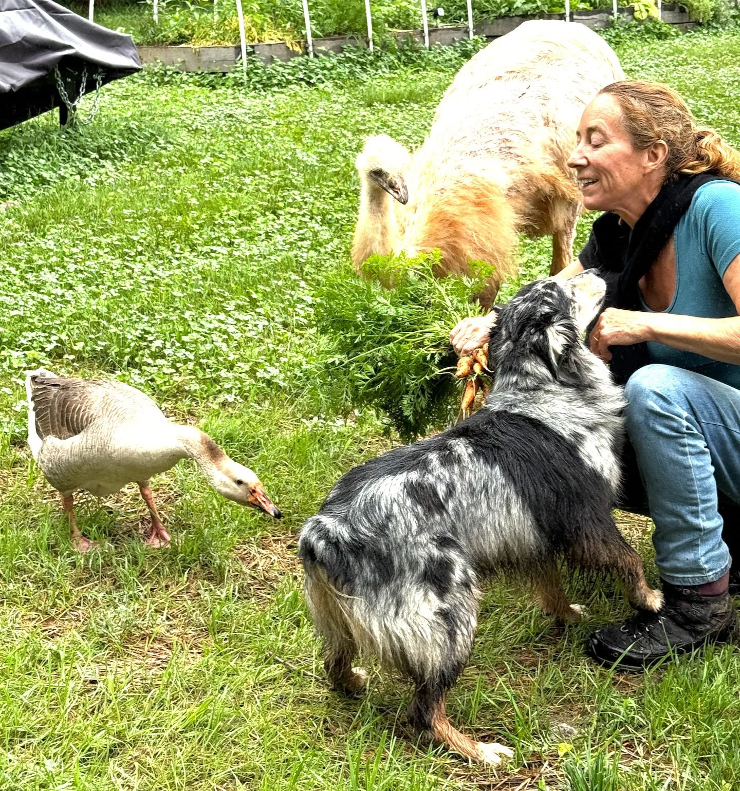 (Of note - Gizmo, Gonzo, Nina, Bella, and Oso have no interest in carrot tops, no matter how much Jill waved them around. But later, the chickens ate every bit of that greenery - with gusto). Around here, nothing goes to waste.