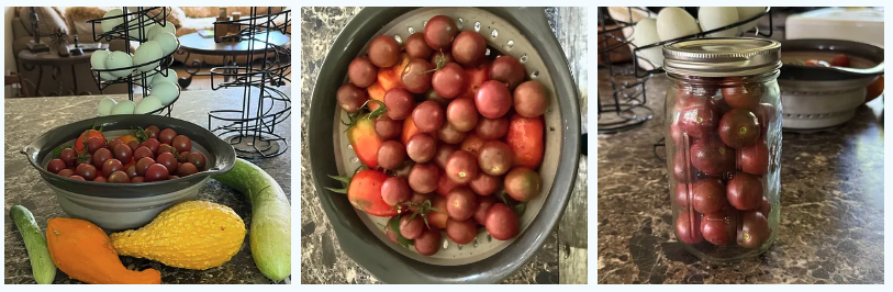 However, Jill has since stopped using plastic bags for freezer storage, so this year she is putting the cherry tomatoes into mason jars. As there is a lot of air between the tomatoes, she didn’t bother leaving room at the top of the container. But when she makes tomato sauce to freeze, she always leaves an inch or more at the top of the jar for expansion.