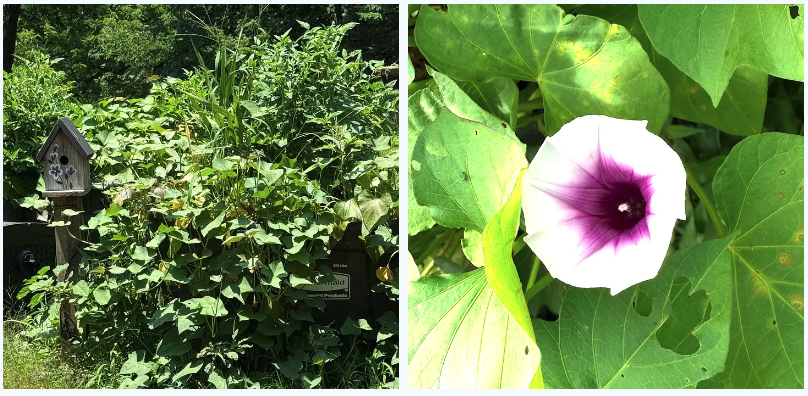 The vines of the sweet potato are verdant and now sprawl all over the patio area. For those who follow this Substack closely, you may recall that Jill planted out two old stock tanks with sweet potato slips in the spring. We started these plants from last year’s sweet potatoes in the house, and now they have grown into a mound of dark green foliage. But even better, it turns out that with each new morning light, light purple flowers can be seen peaking out from behind the tangle of leaves. Then come evening, the sweet potato flowers close up and go to sleep.