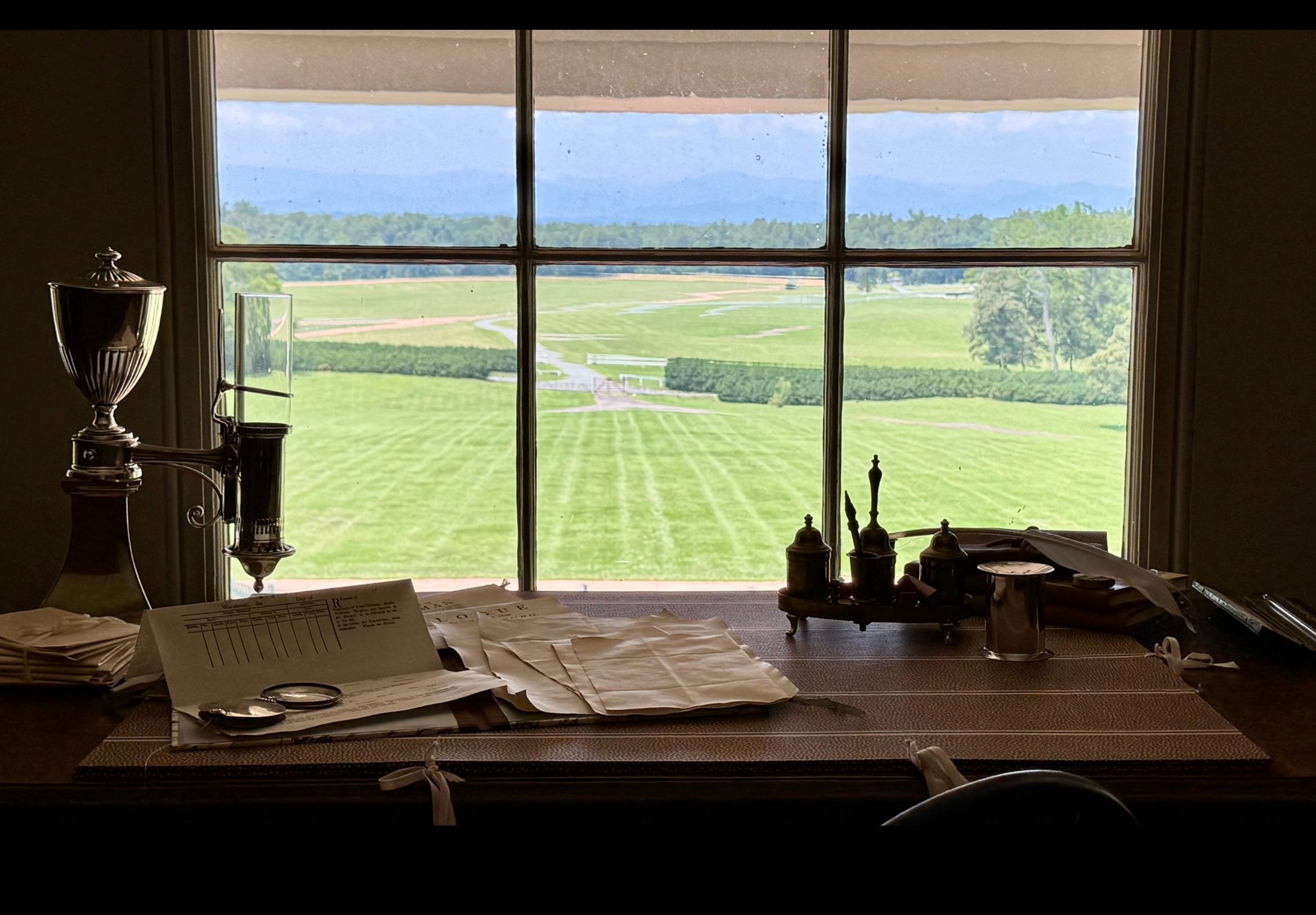 So there we were - some 250 years later, in Madison’s home, looking at the exact desk and at the view where he wrote the US Constitution (known first as the Virginia Plan) at Montpelier, Virginia. Madison credited this view of the Blue Ridge Mountains in the background of this photo as his muse for his writings, which formed the structural backbone of our legendary republic.