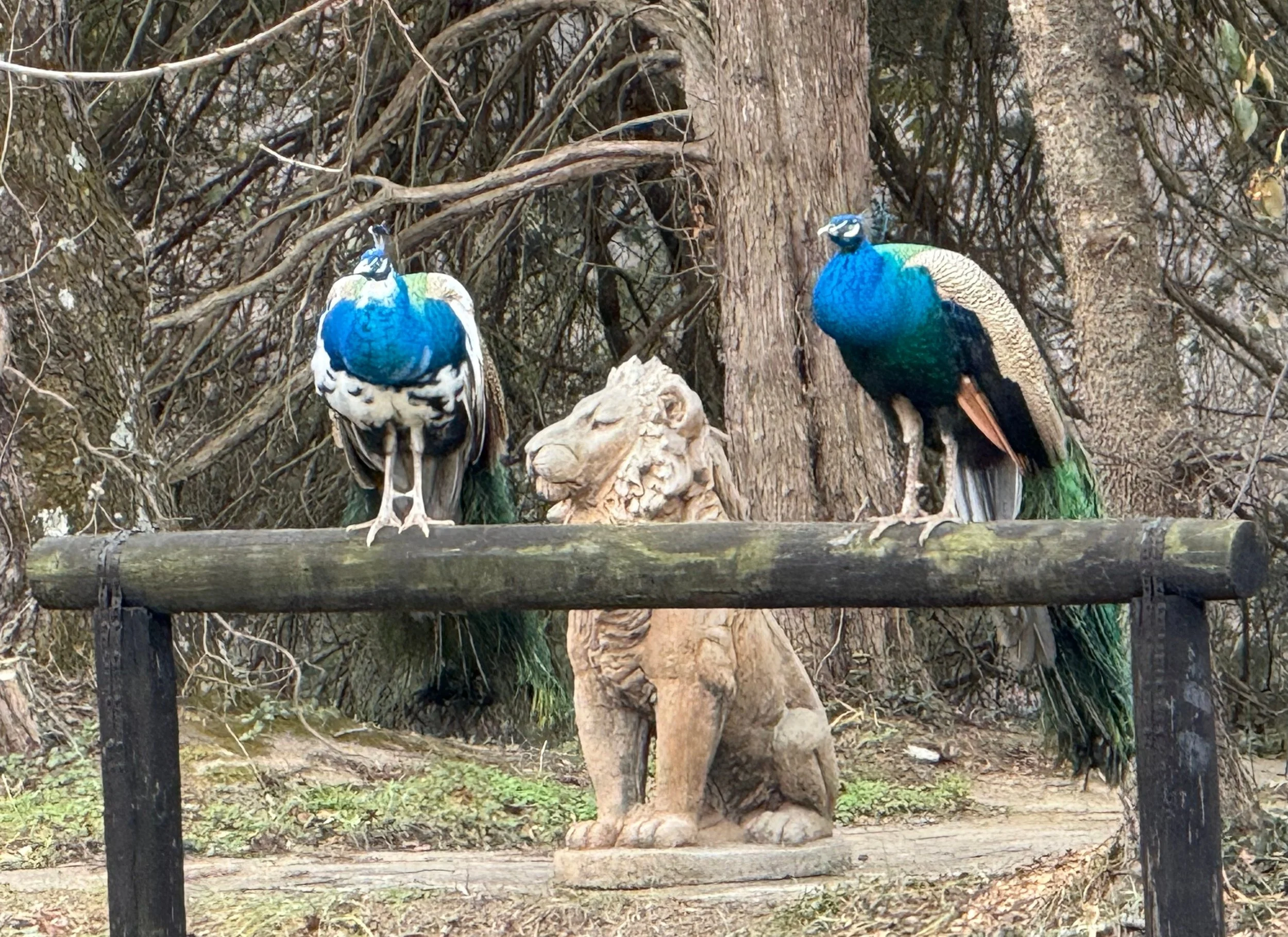 The two peacock brothers have rekindled their “bro” relationship, now that breeding season is over. Going with the Narnia theme, they are Prince Caspian (left) and Trumpkin (right). The lion is named Aslan.