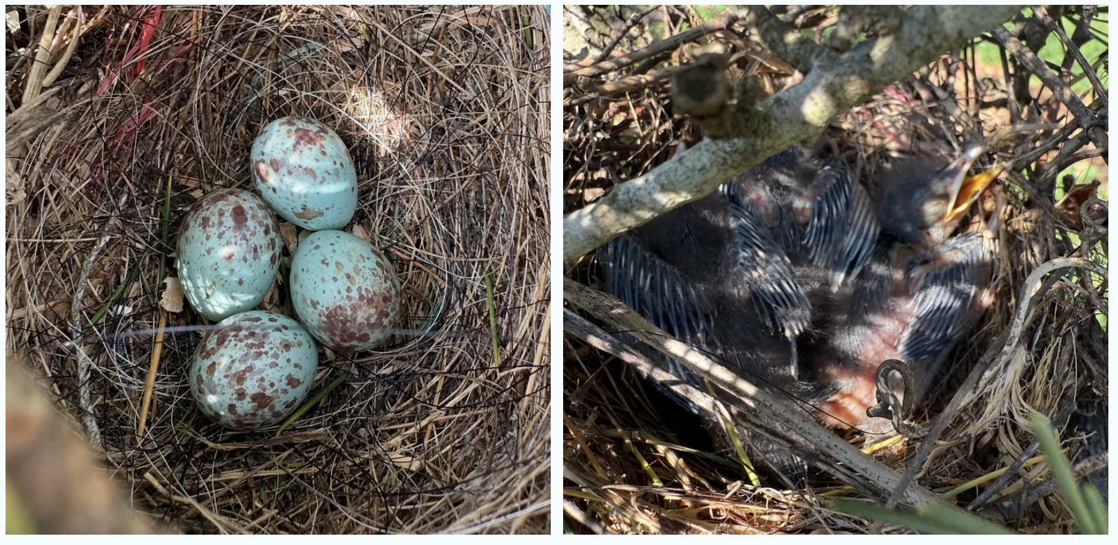 Other news on the farm, the mockingbird (?) babies have now hatched and are just starting to feather out.
