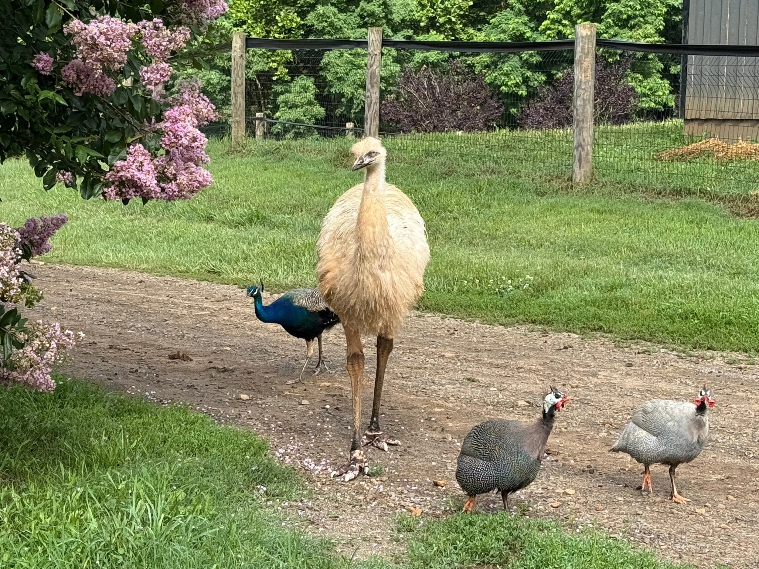 Most days, the emu and peacocks spend their time in the shade, with much panting to cool off.