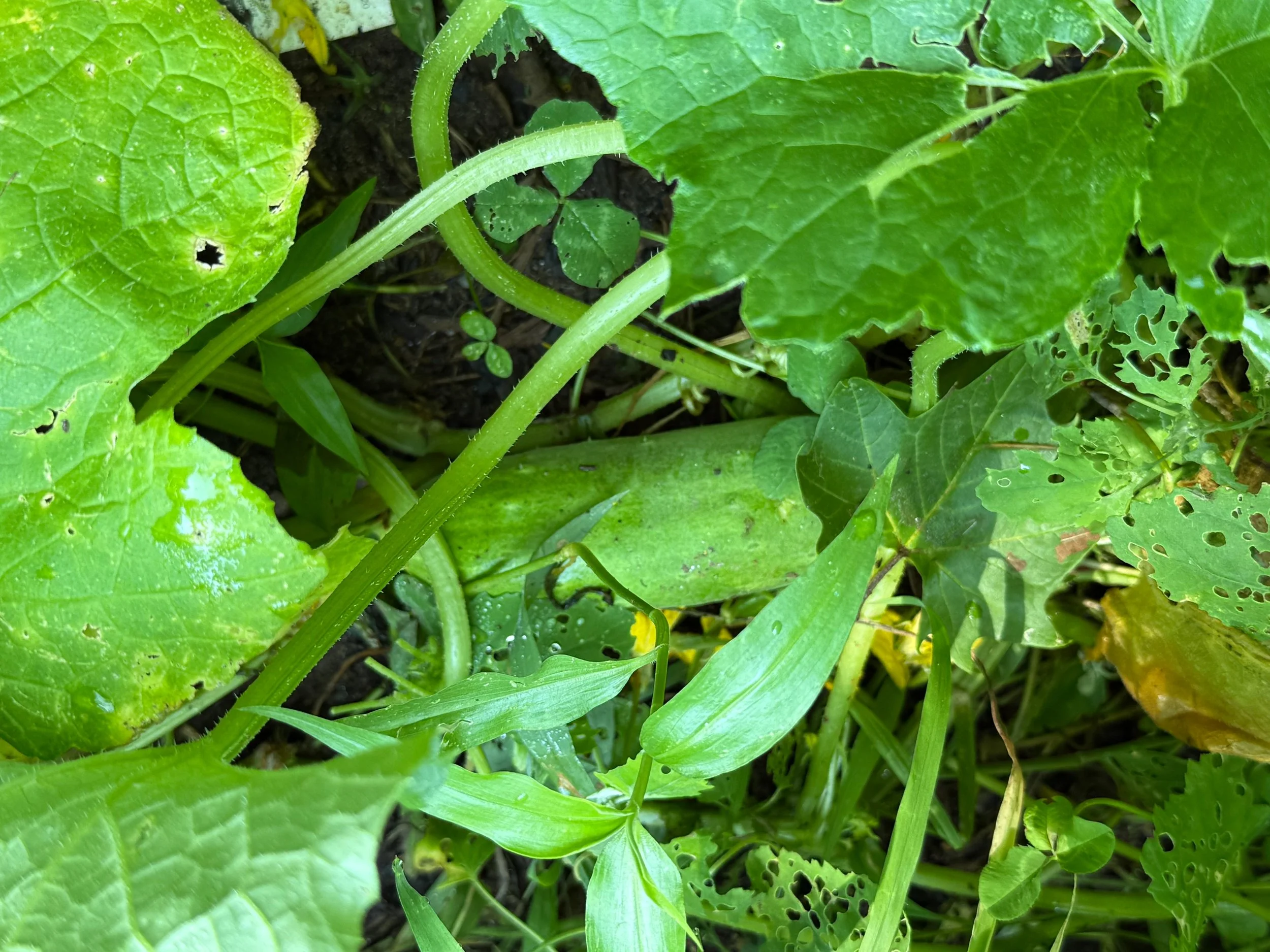 Late June in the garden: The squash is at a stage where the little fruits are the most succulent, and the plant resembles an ornamental. Just give it a week, and the plant will have overtaken an acre, and the squash will be a foot long and hard as a rock.