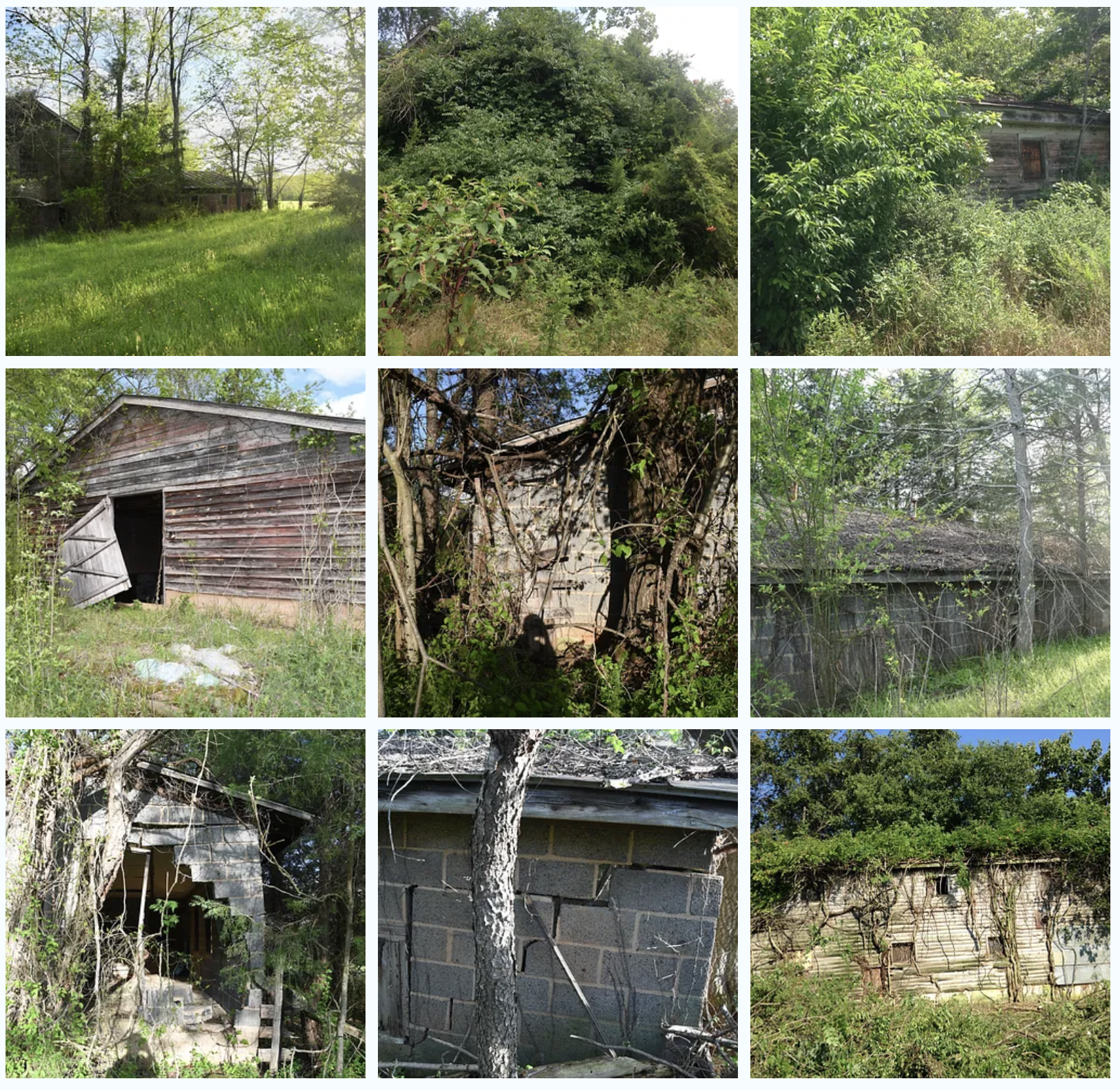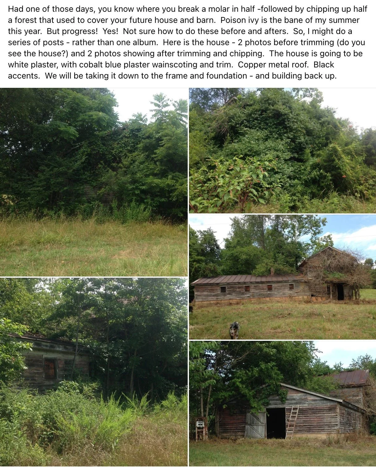 A local farmer had made hay off the pastures for years, but those bales were just basically weeds for cattle. The making of hay for decades without putting anything back into the earth had pulled all the nutrients out of the soil decades ago. All the barns and out buildings had been left to rot for 60+ years. Over the decades, climbing vines, including poison ivy, wisteria as well as trees had encapsulated the structures, until no one even knew it was once a thriving farm. Heck, no one could even see the buildings! The driveway in - was hidden from the street. The old farm had essentially returned to wilderness.