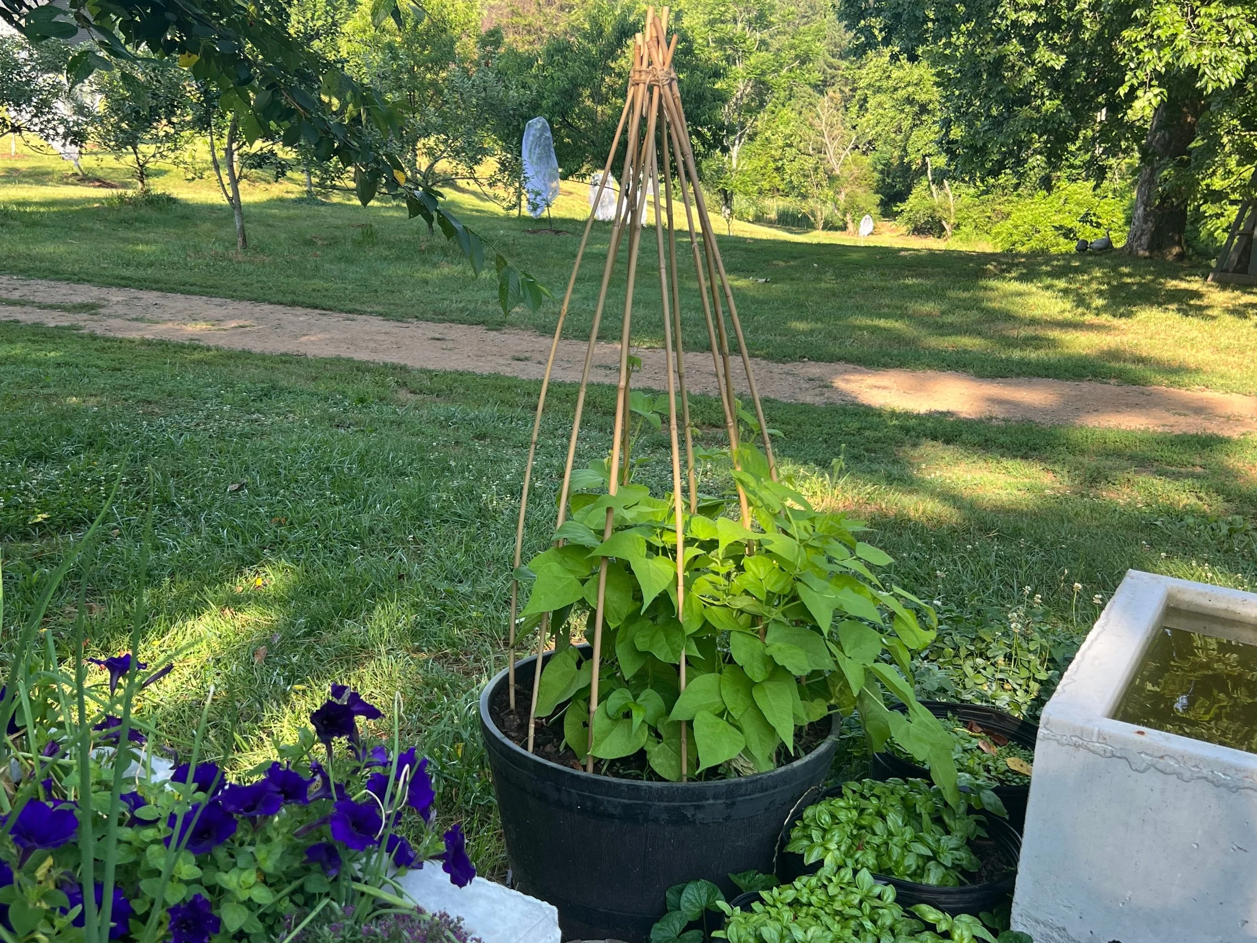 Shallots, thyme, oregano, day lilies, sage, basil, peppermint, and spearmint are mixed in with the flowers. The two lemon and lime trees are new, and will be joining our 8 year old lemon tree, which used to overwinter in the house but all three will get to try out the new greenhouse next winter. Even Thomas Jefferson had an Orangerie in his nearby farm (Monticello), so there is a strong local tradition of cultivating outdoor citrus and then overwintering the trees indoors.
