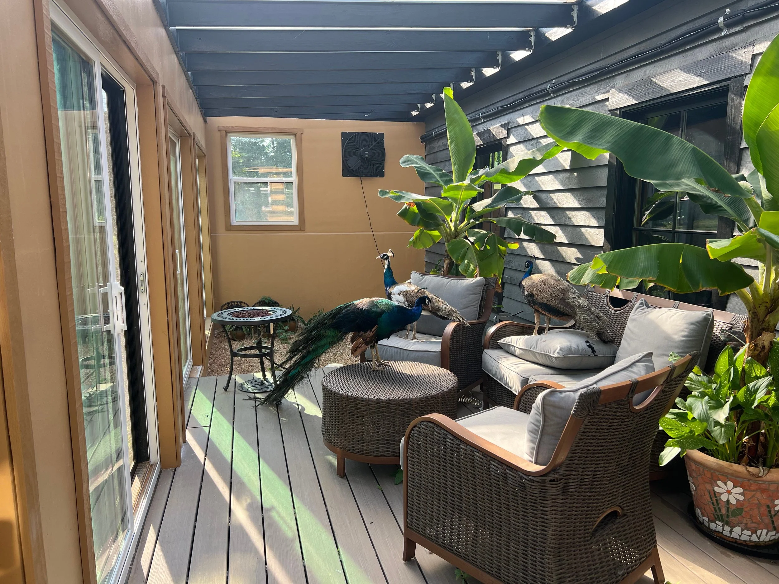 The peacocks do like to sneak into the greenhouse, but only when they can.