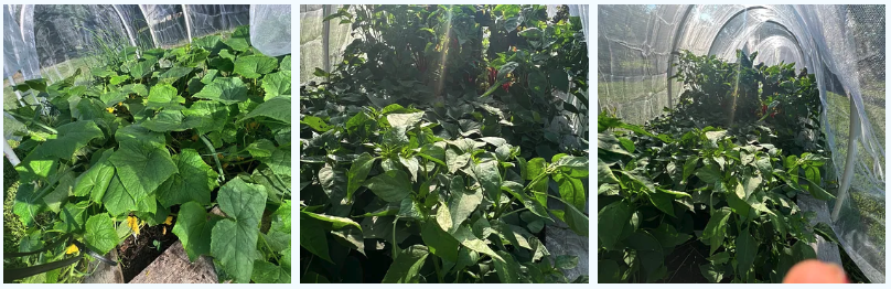 The vegetable plants inside are thriving. The netting provides a bit of shade and seems to help hold in the water.