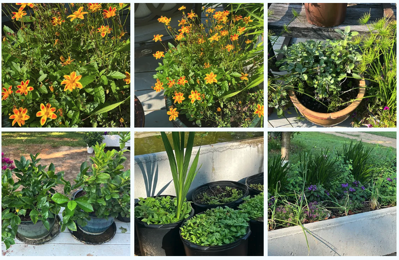 A lot of flowers and edibles are in the pots.