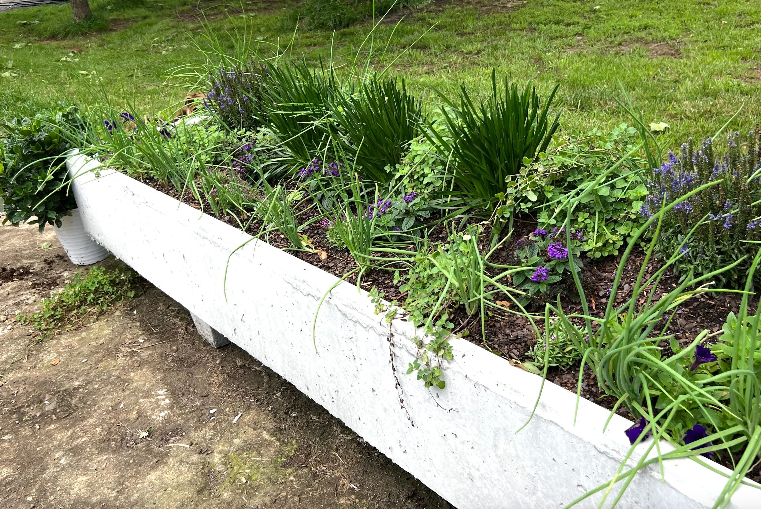 Mixing ornamentals and vegetable/herb plants can be a lot of fun. Below is a cement water tank for cattle, which we use for ornamentals. Shallots add texture and the oregano is a wonderful trailing vine - that adds a lot to any hanging pot or raised bed.