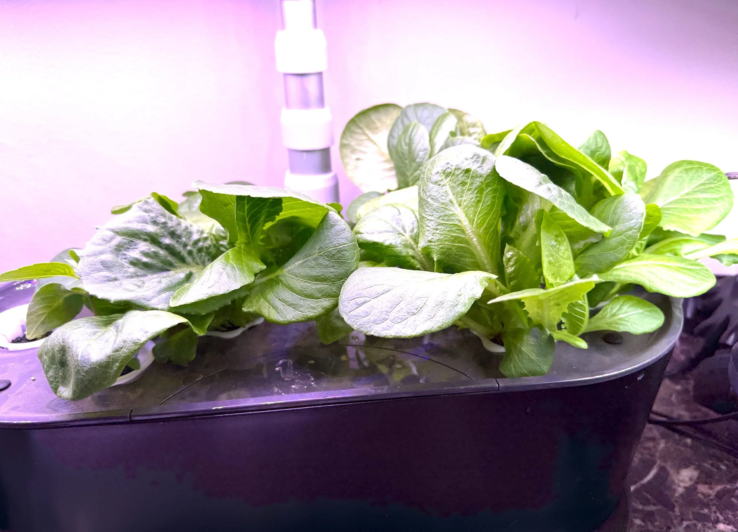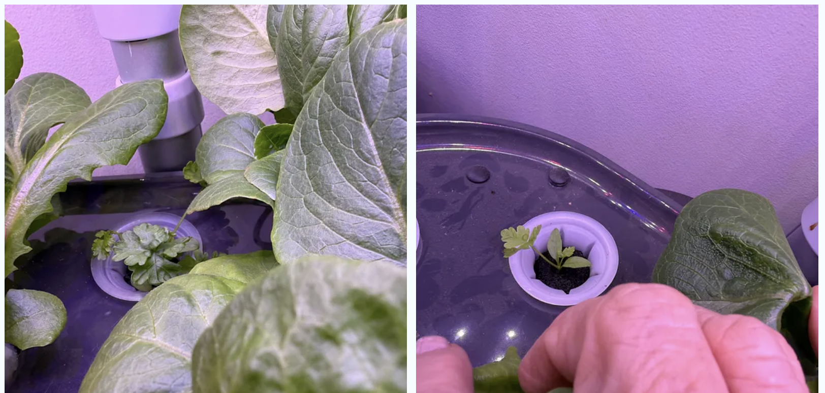 We use hydroponic indoor gardens for two very different purposes. The first is to grow food for eating now. It is excellent for greens such as lettuce and basil, as well as other herbs like dill or parsley (which can be transplanted later in the year). We either harvest the whole plant or take leaf cuttings. However, the Aero Garden is not great for growing larger vegetables for their entire cycle, like tomatoes or peppers. It doesn’t work because the more extensive roots become bound up in the motor, and they outgrow the size of the system.