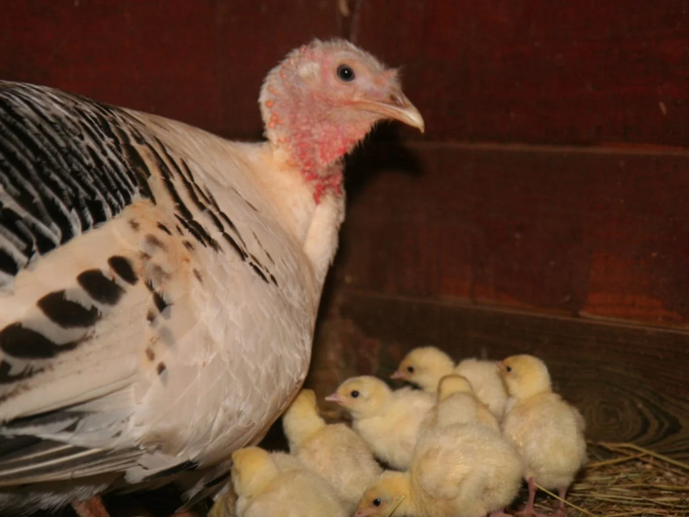 One of our hens from years past, with a clutch of babies
